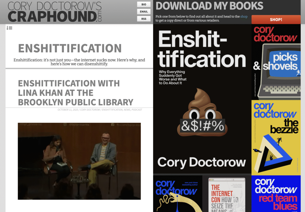 I’ve been a long-time Cory Doctorow fan. His new book Enshitification is delicious. Yup – I understand that a shit emoji doesn’t inspire deliciousness.